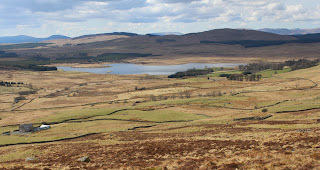 Spring had sprung at last. I saw a wheatear and heard curlews and skylarks. And on the drive home I saw my first swallows of the year. The track entered some trees and emerged at the old ruined farm. It must have been a lonely place to live. After passing the buildings it was on to the grassy hillside with good views back the way I had come. This is looking over the buildings, the trees and the track towards Loch Urr with my second target, Bogrie Hill, beyond......