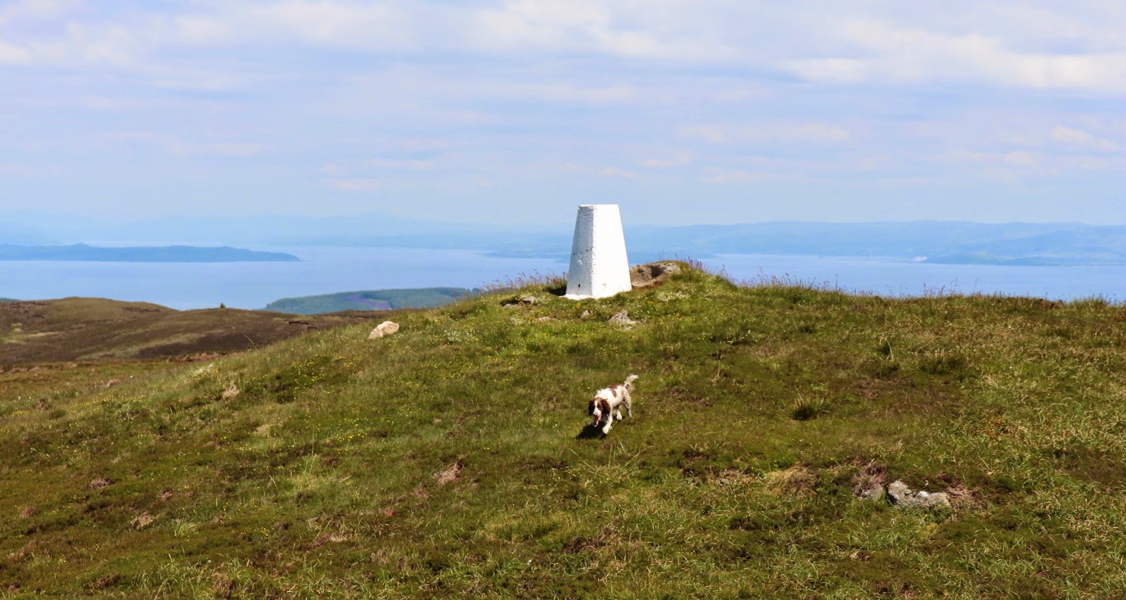 The path ended at the loch and after that it was just a case of ploughing across some rough heather moorland and crossing a few peat hags. I doubt if other than Marilyn baggers would venture further than the path end! However there was very little ascent left to do and around 15 minutes saw us at the top, where there was both a trig and a cairn. The trig looked marginally higher. It was certainly a clear day; I could see the coastline of Northern Ireland, Kintyre, Ailsa Craig, the Ayrshire coast with the Galloway hills beyond and of course Goatfell. Here are a few photographs....