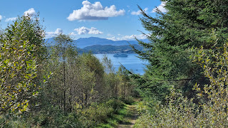I decided to approach this hill from Knockendon bridge on the back road between Fairlie and Dalry. This gave the advantage of a high start, a parking area and as I found, an excellent track all the way to the summit. The track was particularly welcome as the ground is rough hereabouts. The view from the high point, which is close by but not at the trig, is good, especially to the peaks of Arran. You can also see Cumbrae and up the Clyde estuary to Dunoon and the sea lochs. A pictorial record of the climb, a hill that is well worth the little effort required.....